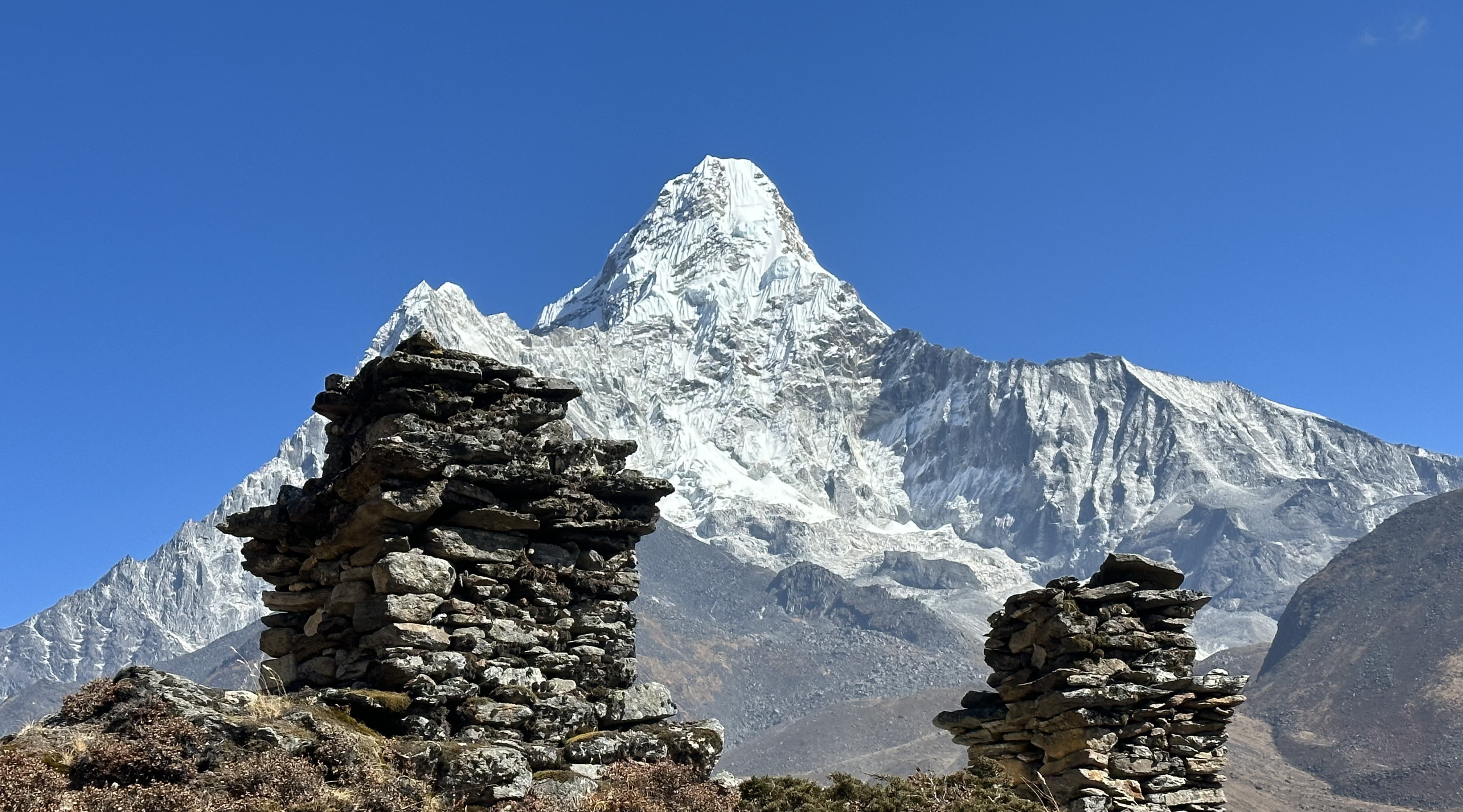 Ama Dablam is one of the most beautiful and iconic mountains in the Himalayas, located in the Khumbu region of Nepal. Its name means "Mother's Necklace" in Sherpa language, referring to the mountain's shape, which resembles a mother's embrace with a necklace dangling from her neck.