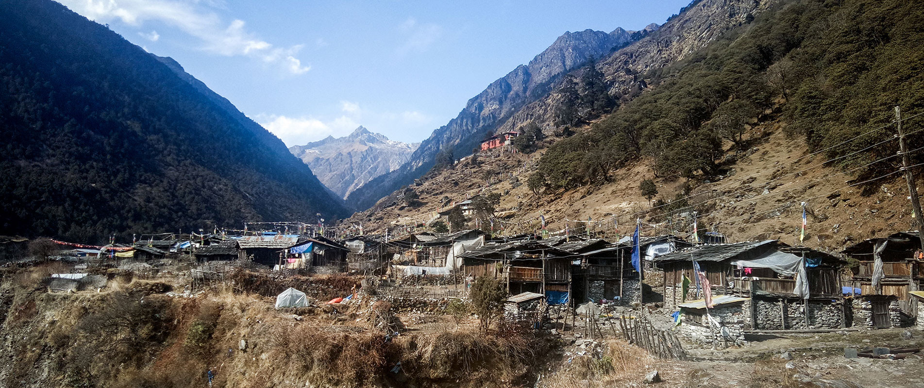 From Chuarikhara, the trail descends for about two hours down to the Arun River. After crossing the suspension bridge over the Arun, it's about an hour uphill to Chyamtang village and an easy 45-minute hike further to Linggam. In Linggam, there are small houses where mainly Bhotiya people live.