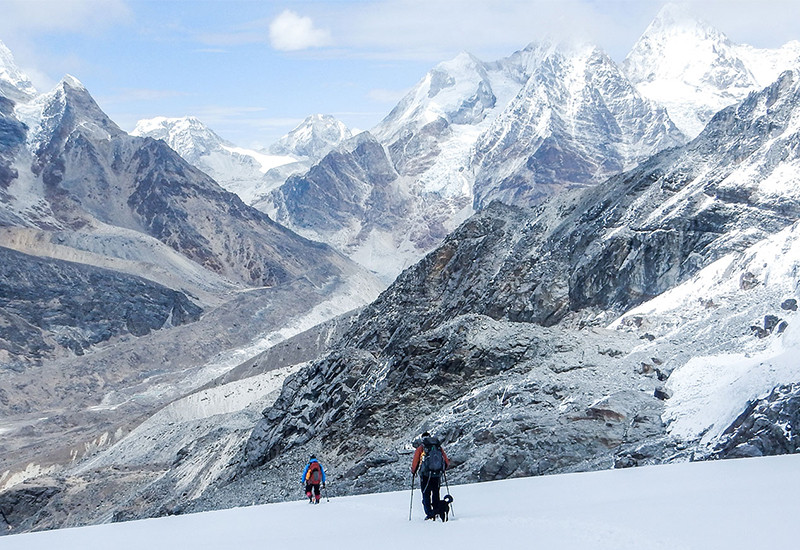 The trail takes us to Gondishung, a summer pasture where there's a mani wall. We'll have lunch here with views of Kusum Kanguru's twin summits to the west and the steep rock face of Mera Peak to the east. After lunch, we hike up to an ancient Gompa housed in a cave beneath a massive boulder. It's considered good luck to perform a puja and burn some juniper twigs as offerings to the gods for safe passage on the mountains. From here, it's an easy hike over the moraines to Thangnak, a cluster of teahouses and yak herders' sheds. We will spend 2 nights here for acclimatization and preparation.